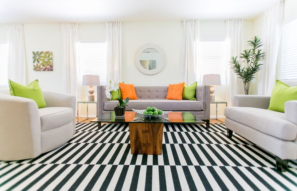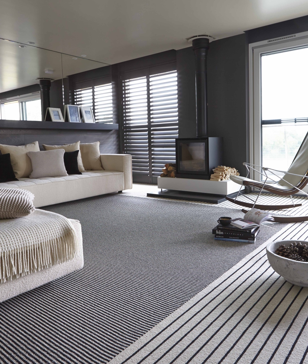 1. Phòng khách sáng sủa trở nên cân bằng nhờ trải thảm sọc đen trắng trải rộng hầu như toàn bộ không gian, trở thành điểm nhấn nổi bật trong phòng.