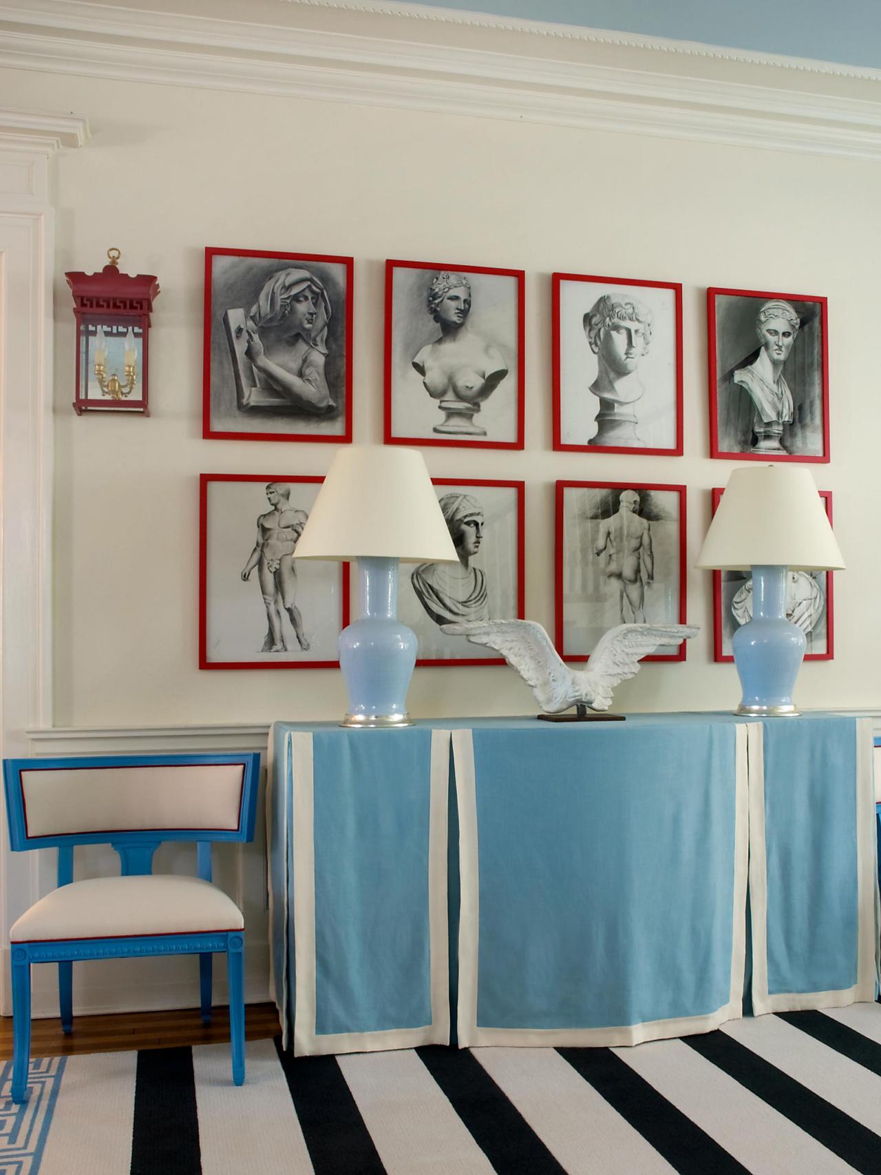 4. Sự kết hợp ấn tượng của màu đỏ và xanh không làm cho căn phòng bị mất cân bằng. Nhờ tấm thảm hài hòa với những đường sọc rộng, phòng khách tạo cảm giác ấm áp, đáng tin cậy.