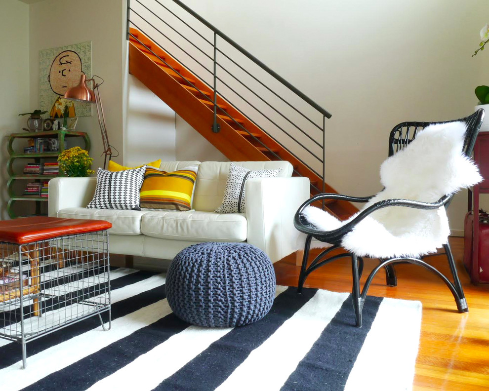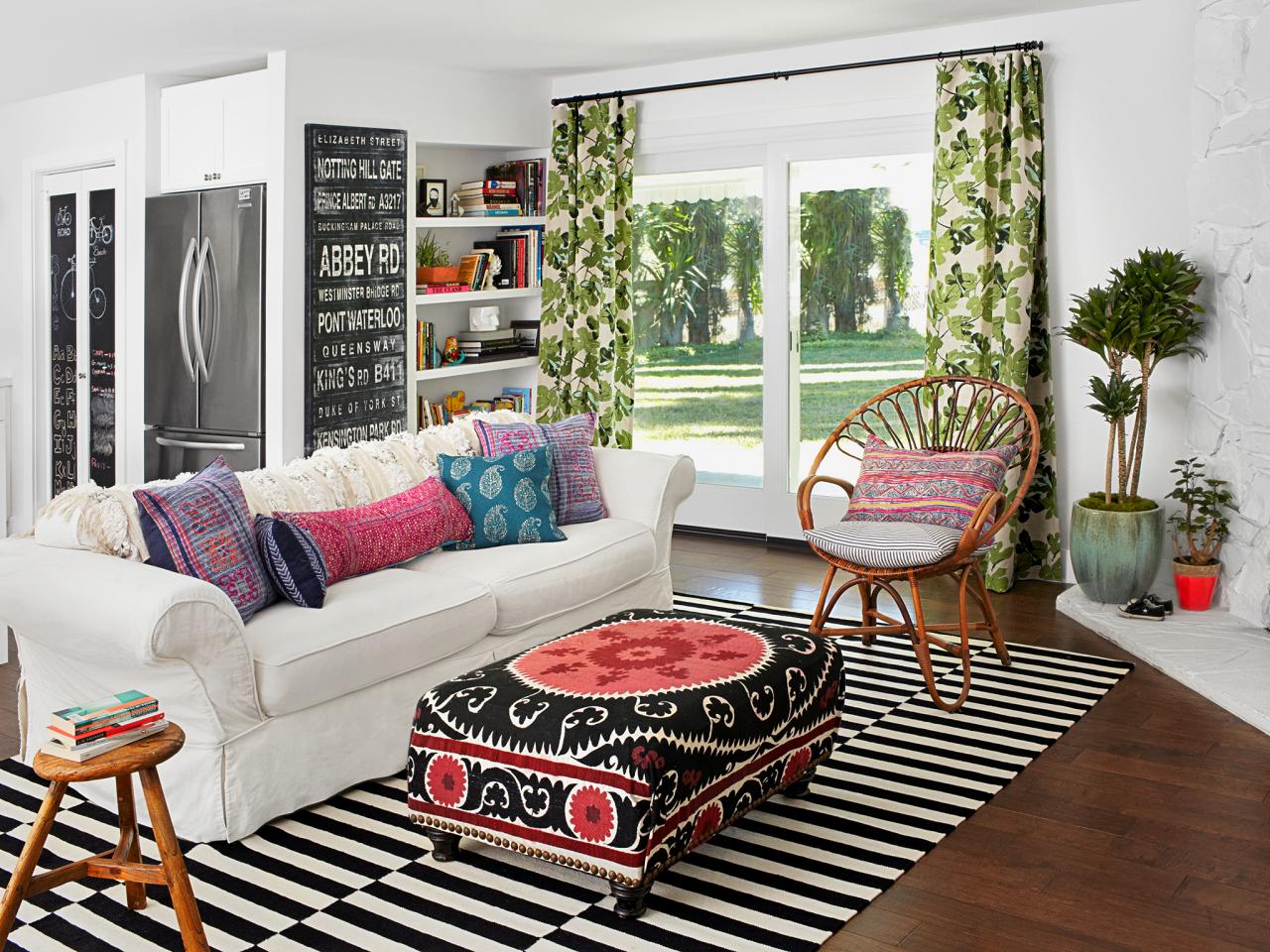 8. Phòng khách với những yếu tố trang trí đầy màu sắc mang phong cách bohemian là một nơi tuyệt vời để trưng bày những tấm thảm kẻ sọc đen trắng. Có thể chúng không tạo được sự nổi bật ngay từ cái nhìn đầu tiên nhưng sẽ mang lại sự cân bằng cho toàn bộ không gian.