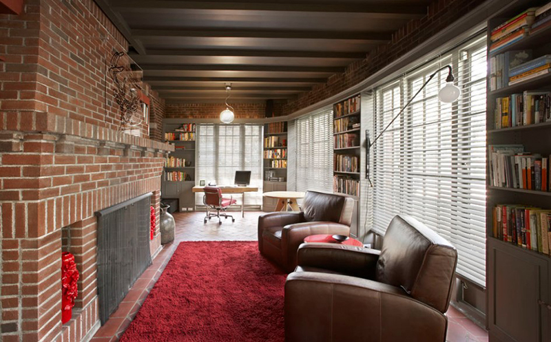 5. Ghế da màu nâu được đặt ở khung cảnh với gạch trần, thảm đỏ và những vật liệu thân thiện với môi trường.
