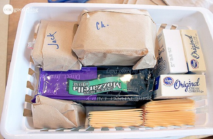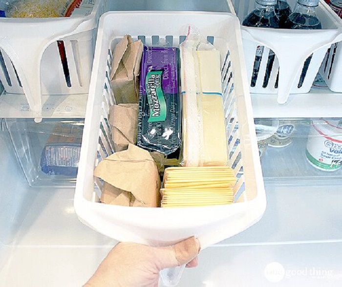 Nguyên tắc đầu tiên khi xếp đồ vào tủ lạnh, những gì cao lớn được đặt ở bên trong. Những đồ ăn chín hoặc nguyên liệu chế biến như bơ, cà chua dùng dở phải được bọc lại bằng giấy nilong bảo quản sạch sẽ. Sắp xếp chúng theo vùng, ví dụ như: những đồ ăn còn thừa cho vào rổ nhựa như thế này. Và cho chúng vào ngăn dưới của tủ lạnh.